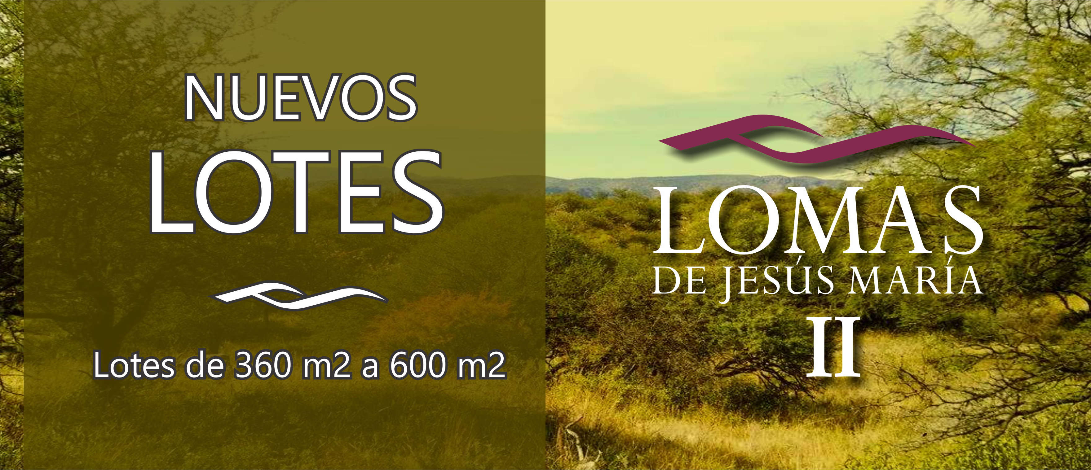 Lomas de Jesús María en su segunda etapa consta de 103 lotes con medidas que van desde los 370 m hasta los 600m. Están ubicados al norte de la primera etapa de Lomas, vecino a Parque Suizo y a escasos metros del centro de Jesús María. Escritura inmediata.